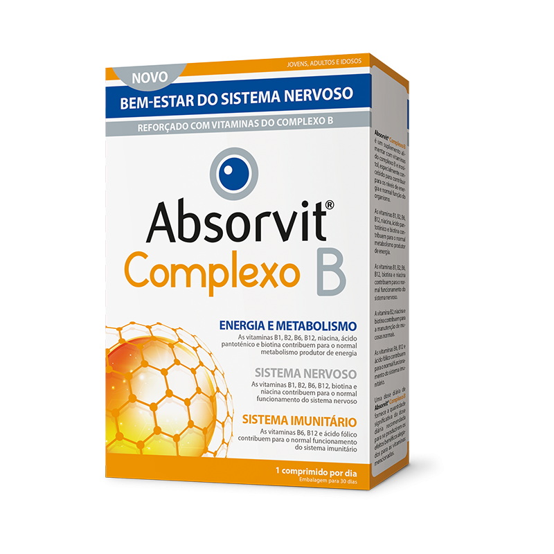 Absorvit® Complexo B é um suplemento alimentar com vitaminas B1, B2, B6, B12, niacina, ácido pantoténico e biotina, especialmente concebido para carências desta vitamina.