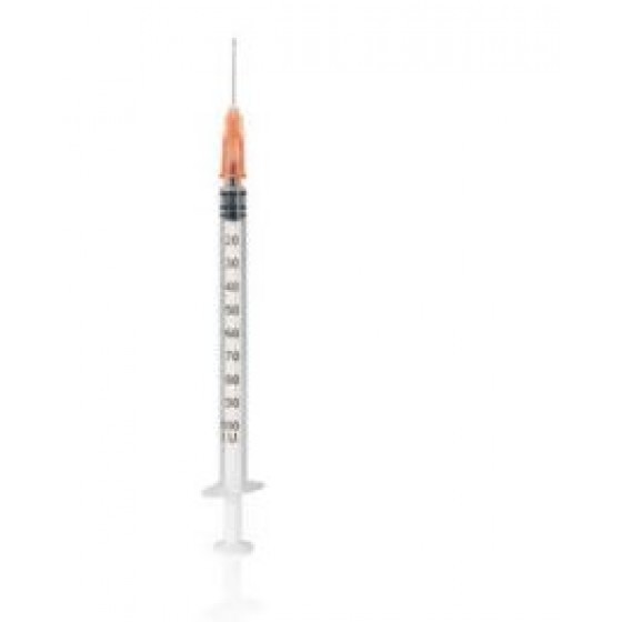 Seringa esterilizada e descartável, com agulha, indicada para a administração de soluções injetáveis.