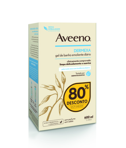 . O Gel de Banho Emoliente Aveeno® Dermexa limpa delicadamente, suaviza e protege a pele muito seca com tendência atópica e com prurido associado. Desenvolvido com dermatologistas, está clinicamente comprovado que limpa delicadamente sem secar. A sua fórmula combina o complexo de Aveia Prebiótica com ceramidas. A pele fica mais suave, reconfortada e com aspeto mais saudável dia após dia. Sem perfume. Sem sabão. Fórmula de elevada tolerância. Adequado para adultos e crianças com mais de 3 anos.