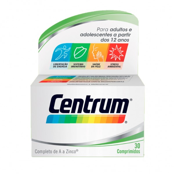 Centrum 30 Comprimidos é um suplemento alimentar multivitamínico, para complementar a alimentação diária dos adolescentes (a partir dos 12 anos) e dos adultos. Feitos à base de vitaminas, minerais essenciais e luteína, estes comprimidos fornecem um conjunto completo e equilibrado de nutrientes indispensáveis ao correto funcionamento do organismo. Reforçam as defesas naturais, protegem dos radicais livres e conferem energia, ao mesmo tempo que contribuem para a saúde dos ossos e dos olhos. O resultado é uma maior vitalidade, imunidade e bem-estar.
