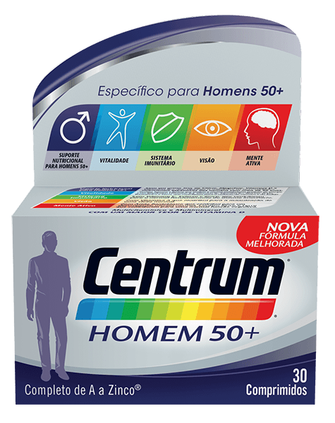 Centrum Homem 50+ é especialmente equilibrado para satisfazer as necessidades de nutrientes dos homens com mais de 50 anos, proporcionando um contributo importante de micronutrientes essenciais (vitaminas, minerais e oligoelementos), e assim tornando-o num suplemento ideal para homens com mais de 50 anos.