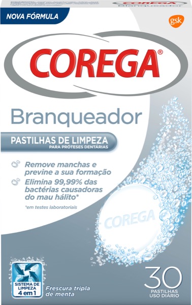 Corega Pastilhas de Limpeza Branqueadoras. Remove manchas e previne a sua formação. Elimina 99,99% das bactérias causadoras do mau hálito*. *em testes laboratoriaisCorega Pastilhas de Limpeza Branqueadoras limpa em profundidade as manchas difíceis (tabaco, café, etc). Elimina 99,9% das bactérias causadoras do mau hálito*. Para próteses dentárias e aparelhos ortodônticos. *em testes laboratoriais