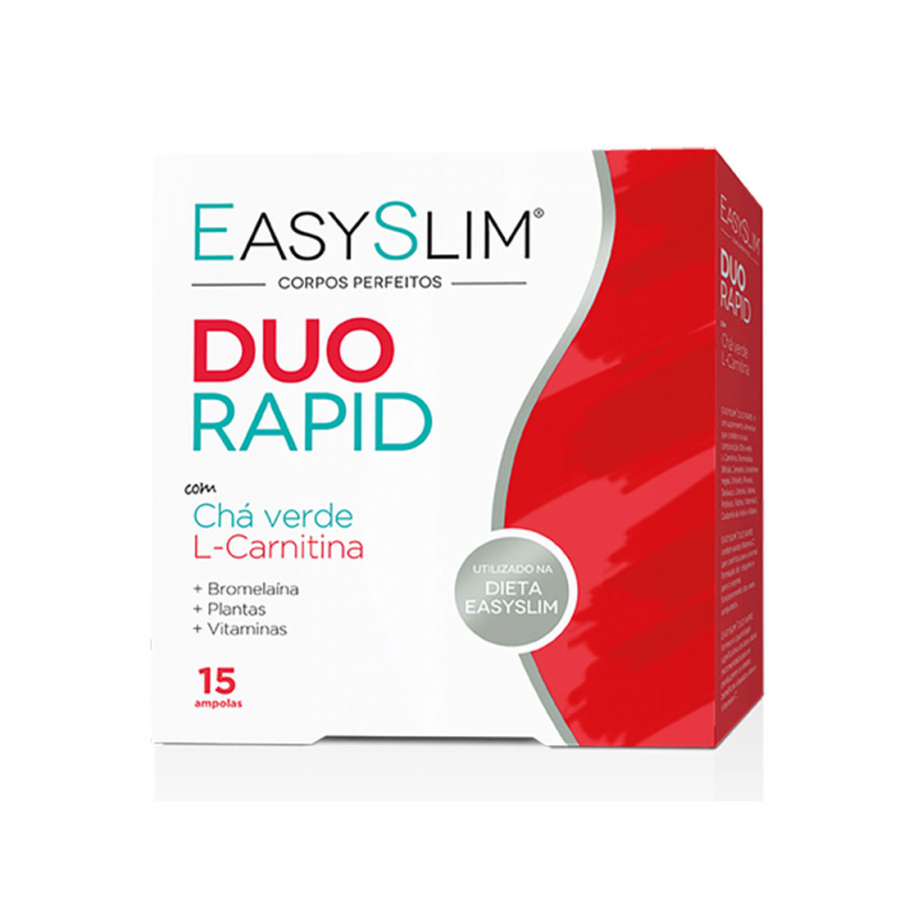 EASYSLIM® DUO RAPID é um suplemento alimentar que na sua composição contém um complexo fitoativo com Chá verde, L-Carnitina, Bromelaína, Bétula, Cerejeira, Groselheira negra, Taráxaco, Castanha-da-Índia, Rainha- dos-prados, Videira e Vitaminas. A Vitamina C contribui para a normal formação de colagénio para o funcionamento normal dos vasos sanguíneos.