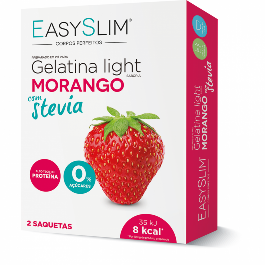 Gelatina de morango adoçada com stevia hiperproteica e de baixo teor energético. As EasySlim® Gelatina Light com Stevia são frescas, saborosas, sem açúcares e apenas com 8 Kcal, ideias para comer a qualquer altura do dia. Permitidas desde a 1ª fase da Dieta EasySlim®.