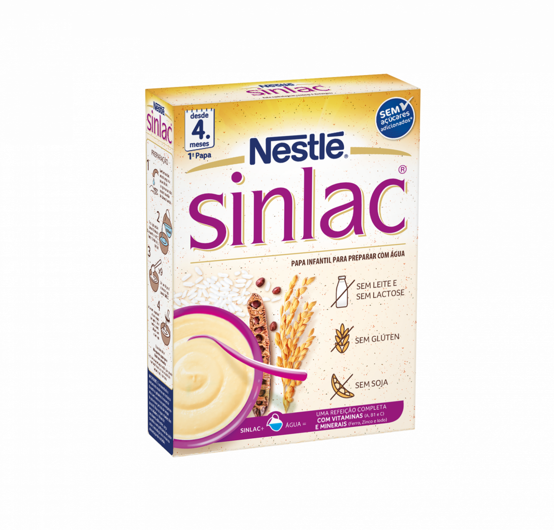 NESTLÉ SINLAC é uma papa infantil, sem açúcares adicionados, sem leite, sem lactose, sem glúten e sem soja, para preparar com água, especialmente indicada para bebés a partir dos 4 meses com intolerâncias e/ou alergias alimentares a estes ingredientes.   A Organização Mundial de Saúde (OMS) recomenda o leite materno em exclusivo até aos 6 meses de idade, devendo prolongar-se tanto quanto possível. Uma vez que os bebés crescem a ritmos diferentes, os profissionais de saúde devem aconselhar os pais qual é o momento mais adequado para a introdução dos novos alimentos.