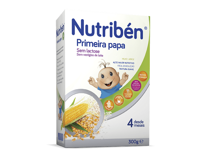 Nutribén Primeira papa é uma papa de adequado valor energético à base de cereais sem glúten, facilmente digeríveis (milho e arroz) e sem açúcar adicionado, contém apenas os açúcares naturalmente presentes nos cereais. É ideal para a introdução dos cereais na alimentação do bebé desde os 4 meses. Sem lactose e sem vestígios de leite.