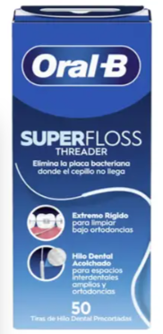 Os três componentes únicos da Super Floss da Oral-B (a extremidade rígida, a parte esponjosa e a secção de seda padrão) atuam em conjunto para obter os melhores benefícios.