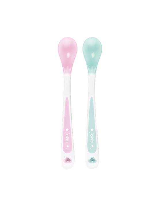 Prático conjunto de duas colheres térmicas com um sistema prático: a sua ponta macia muda de cor quando em contacto com alimentos quentes, indicando assim se a comida está muito quente.