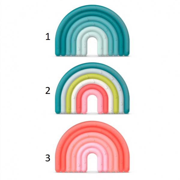 Mordedor em 100% silicone com diferentes relevos e texturas, permite aliviar os sintomas do nascimento dos primeiro dentinhos do bebé, Devido ao ser formato ergonómico facilita a pega pelo bebé.