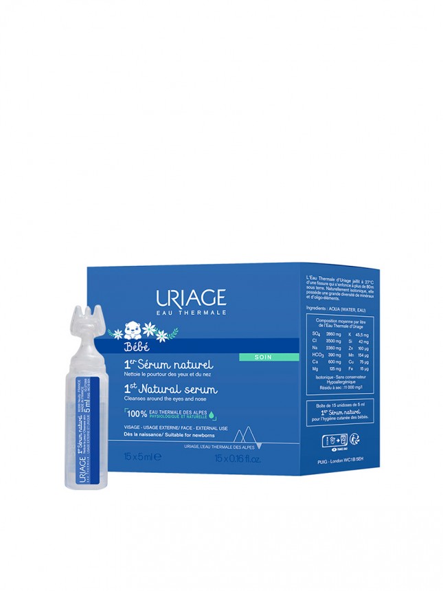 Água Termal de Uriage dos Alpes Franceses, fisiológica e 100% natural. Higiene suave do contorno dos olhos e nariz dos bebés e crianças. Com uma concentração excecional de minerais e oligoelementos, tem propriedades calmantes e suavizantes.