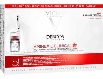 VICHY Dercos Aminexil Clinical 5 - Mulher é um cuidado antiqueda multiativo intensivo, para mulheres com queda de cabelo. Uma fórmula concebida para atuar nas 5 causas de queda de cabelo, com: