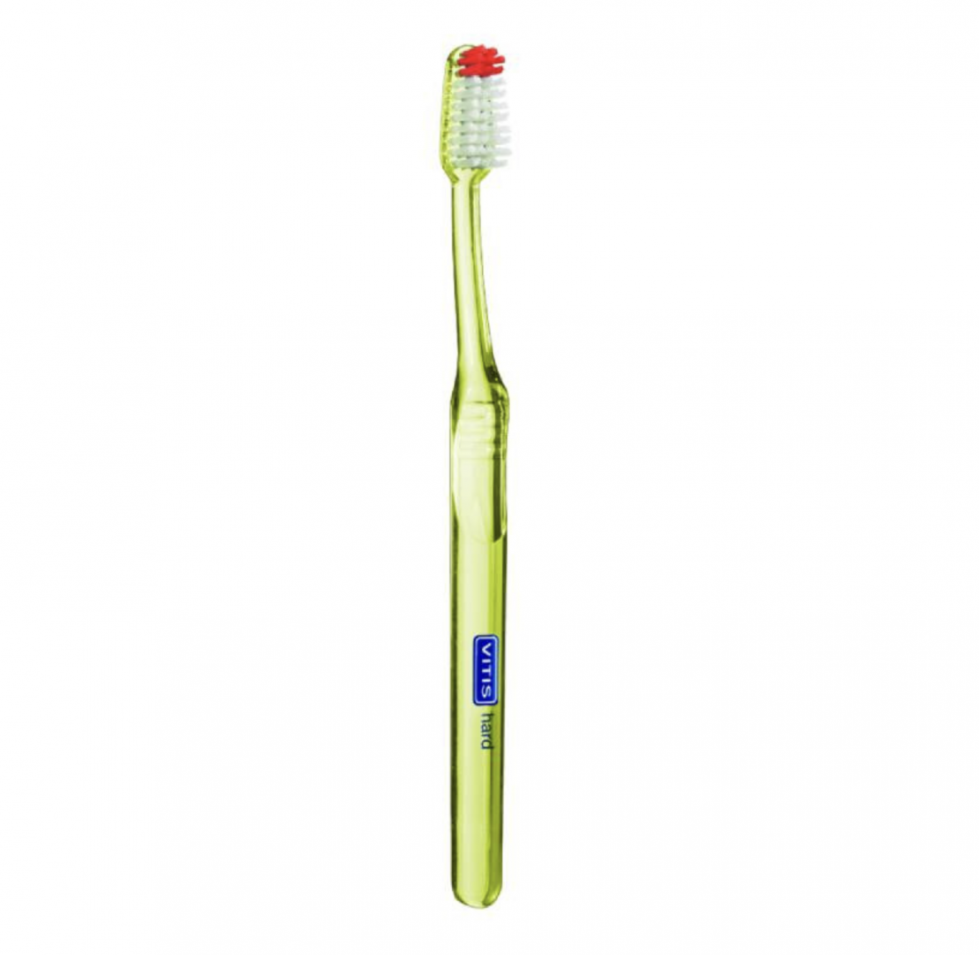 Escova de dentes com filamentos duros e perfil ondulado, especificamente concebida para a higiene oral diária em adultos e pessoas com gengivas saudáveis, sem alterações dentárias ou das gengivas.