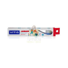 Vitis Junior Escova Dentes +6 Anos é uma escova de dentes com tampa protetora, cabo ergonómico e cabeça pequena arredondada, adaptáveis à mão e boca de criança.